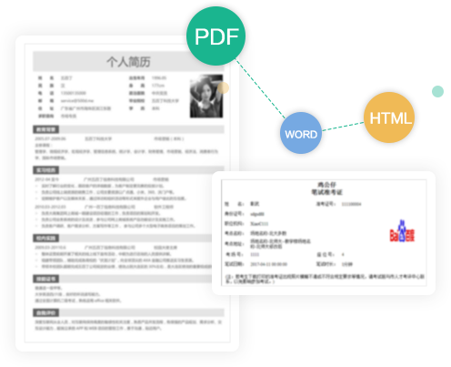 可依据简历表格样式提供定制化服务,支持PDF、WORD、HTML多种格式;除免费提供标准化准考证模板外,还可针对样式单独开发,充分满足招聘细节需求。