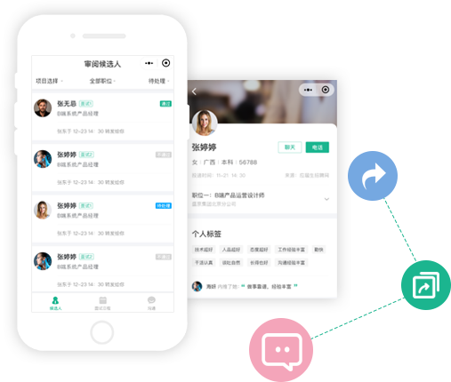 在微信小程序,直接转发简历给用人经理;或扫码转发