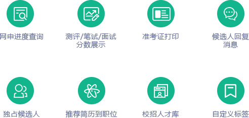 候选人网申进度&笔面试分数自助查询、准考证打印、候选人通知回复状态查询、独占候选人、推荐简历到职位、校招人才库、隐藏面试评价、自定义标签等诸多实用功能,让您的校招轻松高效。